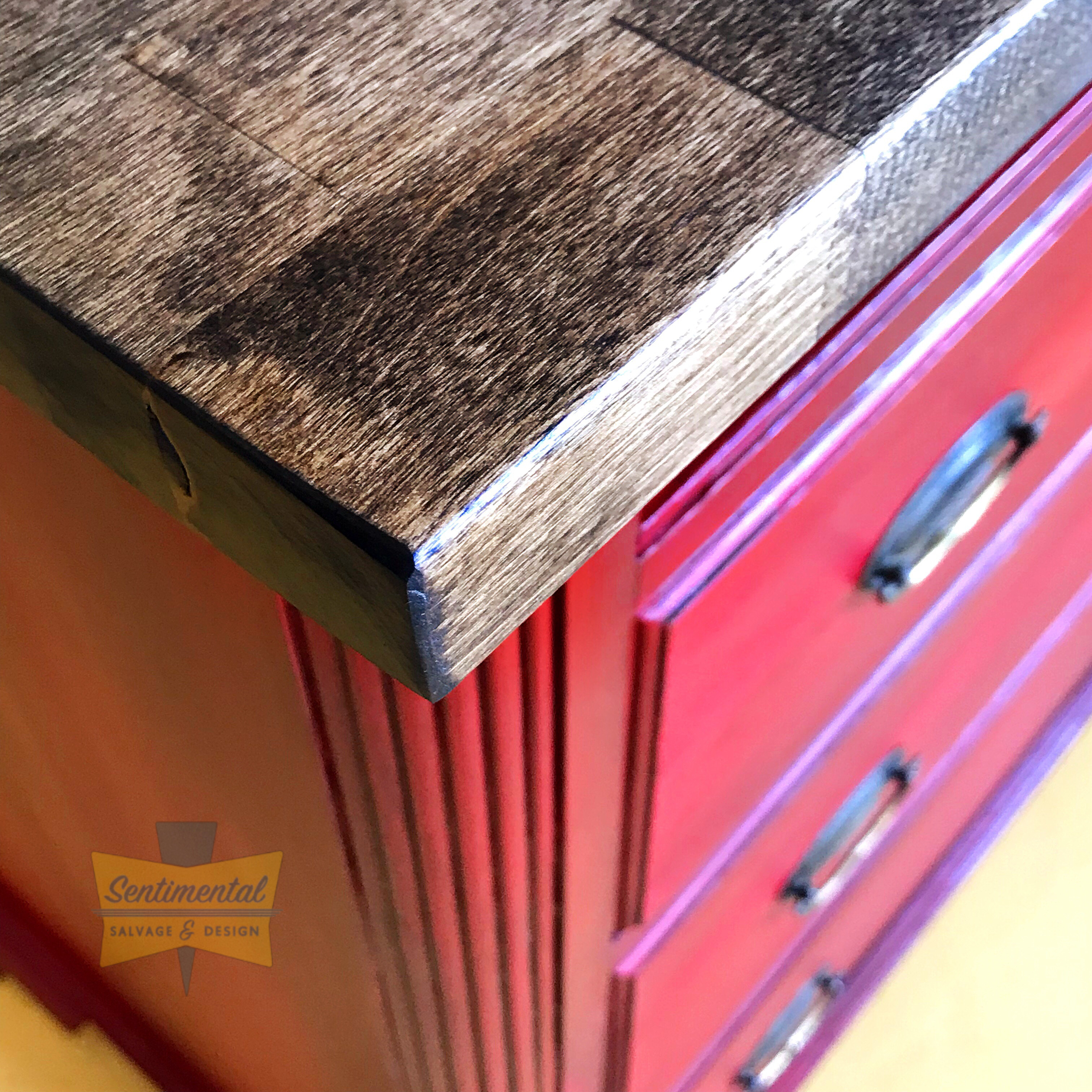 The random dresser top – with the handy drawer – is what I was left with after I created the custom kitchen island (if you remember the red one from a couple months ago). I had to cut the top off of the high-boy dresser to make it the right height for an island. I just put that cut-off top aside in the shop unsure of what I’d use it for. It works perfectly to lift my new scroll saw up to a workable height that won’t kill my back.