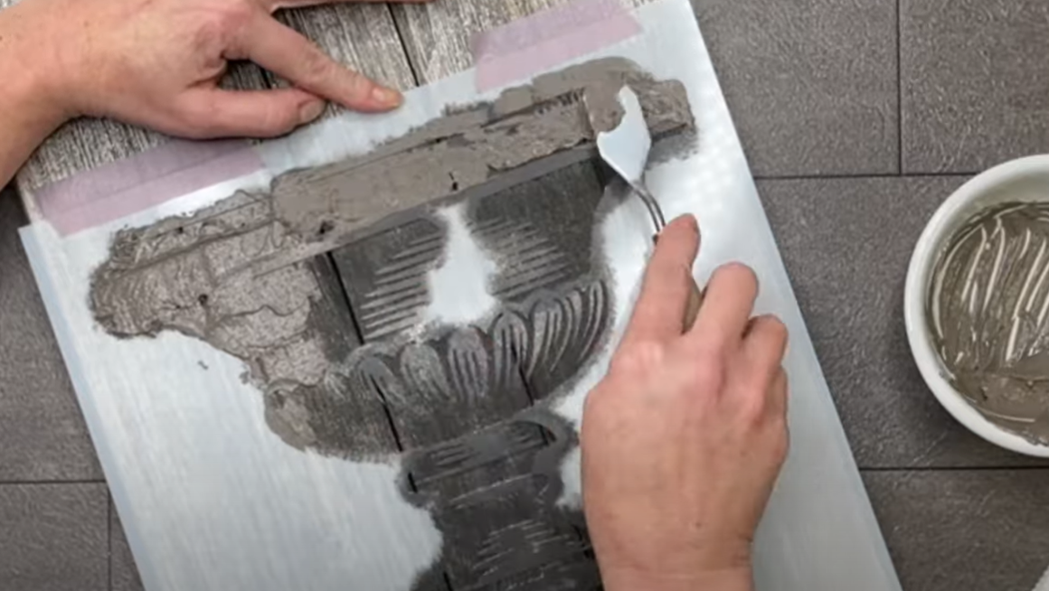 Once your base is dry, you can introduce more texture by mixing your chosen paint color with Salt Wash. Then using a spatula to apply directly onto the stencil, this technique creates a raised effect, creating both visual and physical texture/interest.