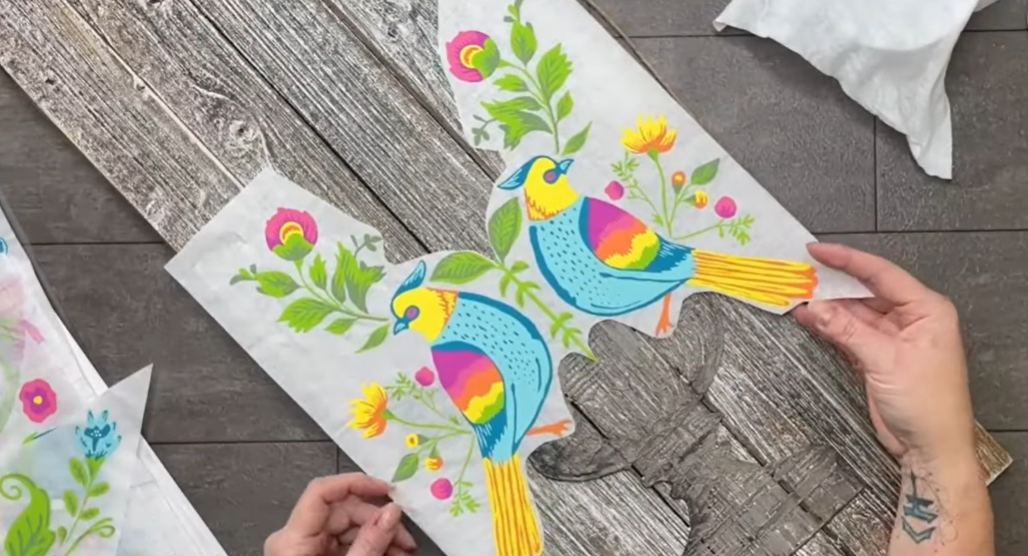 Another trick I’ve learned while using Paint Inlays is that a little mist of water on the backing paper, before you set your Paint Inlay into the setting medium (whether that’s paint or something like Clear Patina) allows the backing paper to stretch and settle down smoothly onto your project. This helps to minimize wrinkles in the backing paper during setting which will be visible as texture in your paint once the backing paper is removed. This technique is more valuable when applying a Paint Inlay to a smooth surface but it did work well on my textured surface also, allowing better coverage in all the peaks & valleys.