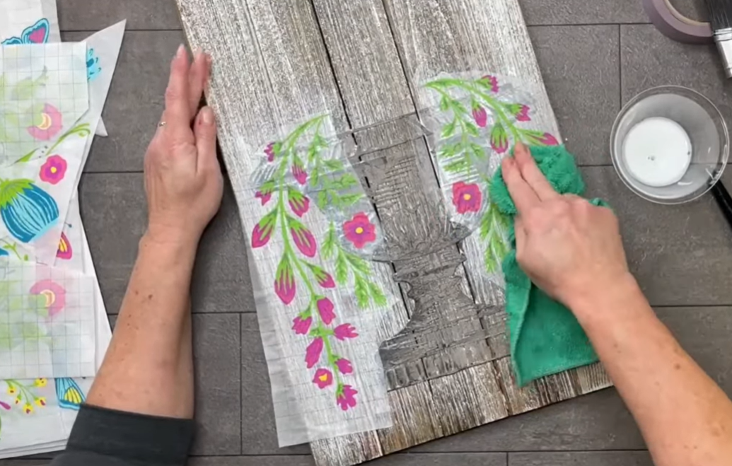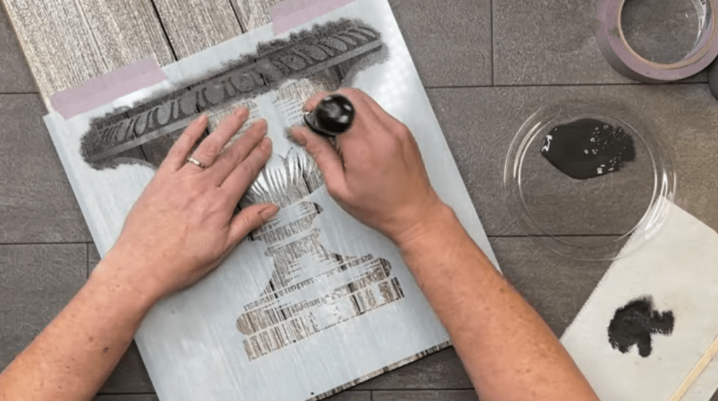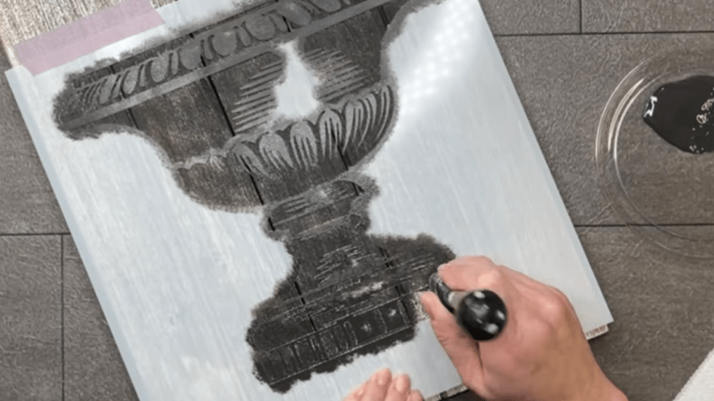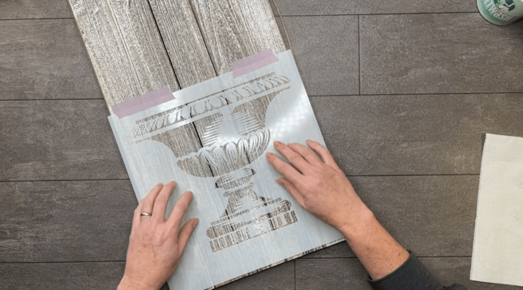 Start by preparing your textured sign. I thrifted this one so when that’s your source, make sure it’s clean and free of any dust or debris. I wanted to use the Roycycled Urn Stencil to provide a visual vessel for the beautiful florals of the Vida Flora Paint Inlay by IOD. It’s important to tape your stencil down securely to avoid movement during the application. A wiggly stencil creates a blurry image.