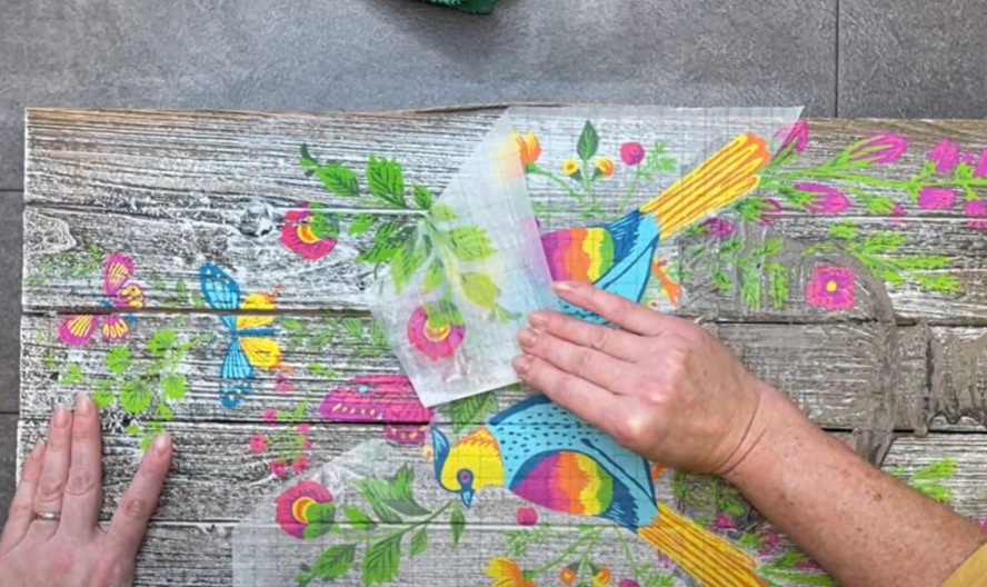 Making sure your raised stencil is completely dry, you’re now ready to apply your Paint Inlay. I chose to use DIY Paint’s Clear Patina as the setting medium. Apply a generous layer of clear patina over your textured project before pressing the inlay down. This is important and you may need to practice a bit to get the right consistency. Too little and your Paint Inlay won’t have enough to ‘set into’, causing missed spots. Too much and you’ll experience excessive wrinkles and creases caused by the backing paper during the drying process.